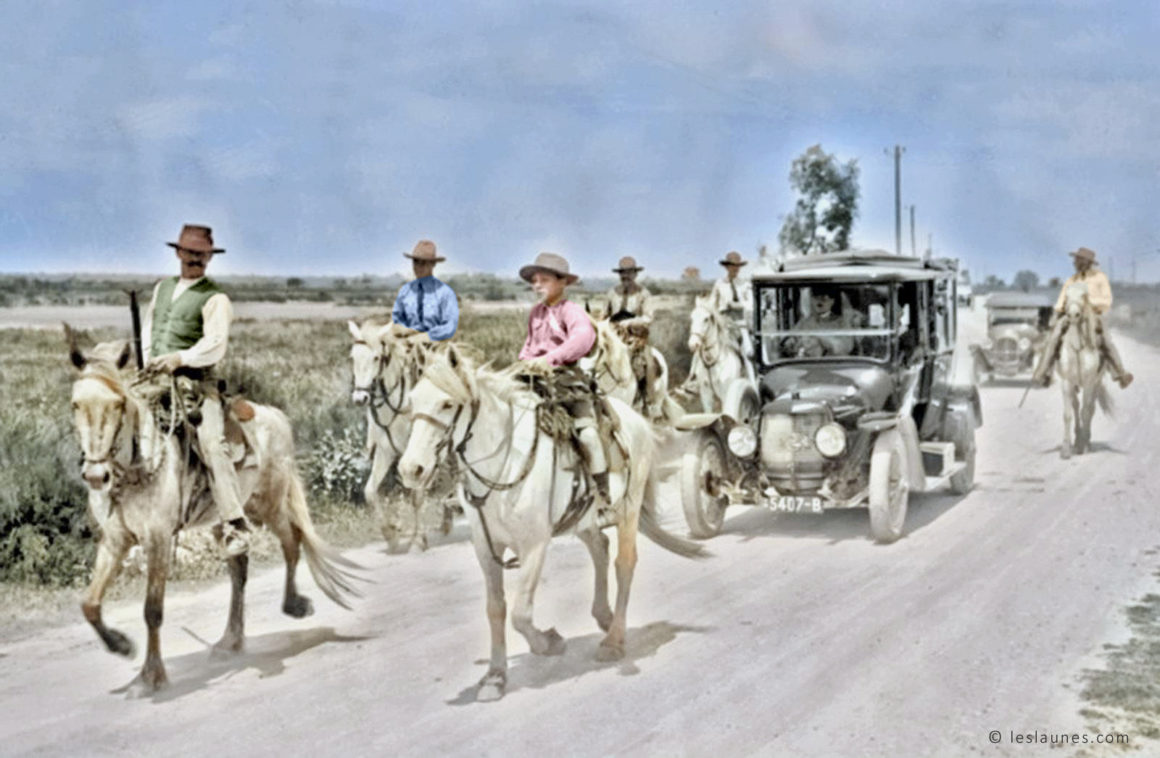 Mai 1923 : Les gardians accompagnent l’arrivée de l’archevêque d’Aix, monseigneur Rivière (source BNF, fonds agence Rol – original N&B – colorisation GR)