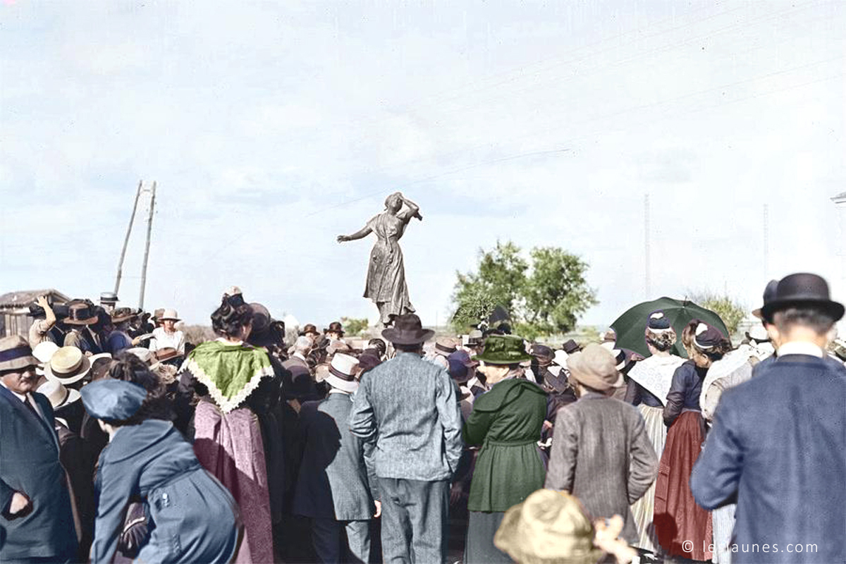 Septembre 1920 : inauguration de la statue de Mireille. La foule devant la statue de Mireille – (source BNF, fonds agence Rol – original N&B – colorisation GR)