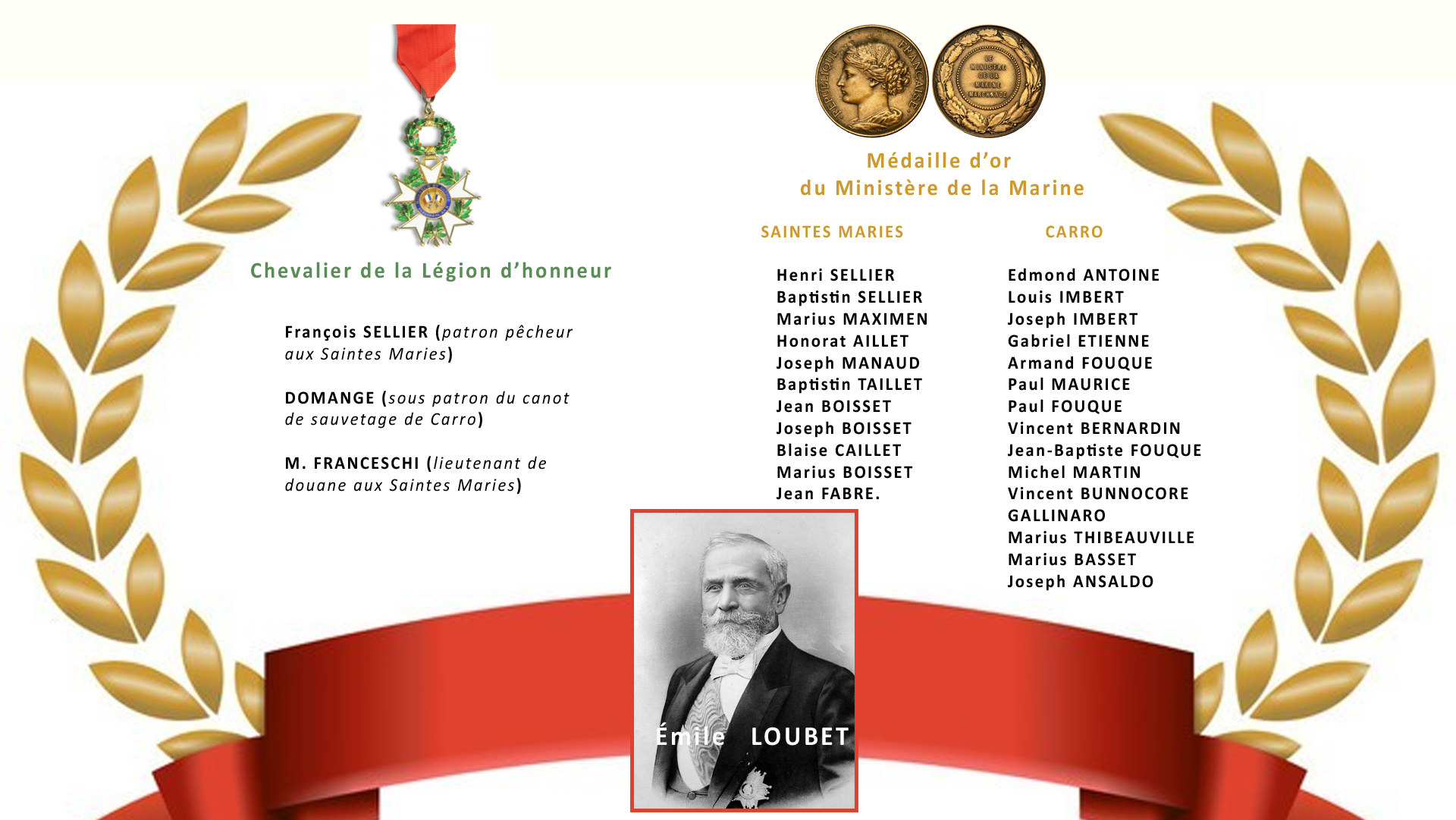 Le 11 avril 1901, le Président Emile LOUBET en déplacement à Toulon, remit lui-même des distinctions honorifiques aux sauveteurs pour acte de courage lors d’une cérémonie empreinte d’une grande émotion. Ainsi, François SELLIER fut décoré de la Croix de Chevalier de la Légion d’Honneur. Les autres sauveteurs saintois reçurent, quant à eux, la médaille d’or du ministère de la marine.
