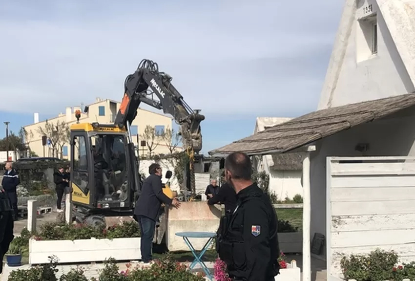 Ici vivait une famille, ici vivait la Camargue. Mais hier matin, le maire des Saintes Maries de la Mer Roland Chassain a fait procéder, avec l’appui de la force publique, à l’expulsion physique de Sylvette César. Ensuite, non content d’avoir fait murer l’ensemble des ouvertures, Roland Chassain a fait disposer des blocs de béton devant les portes d’entrée pour être bien sûr que nul ne pourra désormais habiter les cabanes de gardian vouées à la démolition par sa seule volonté.